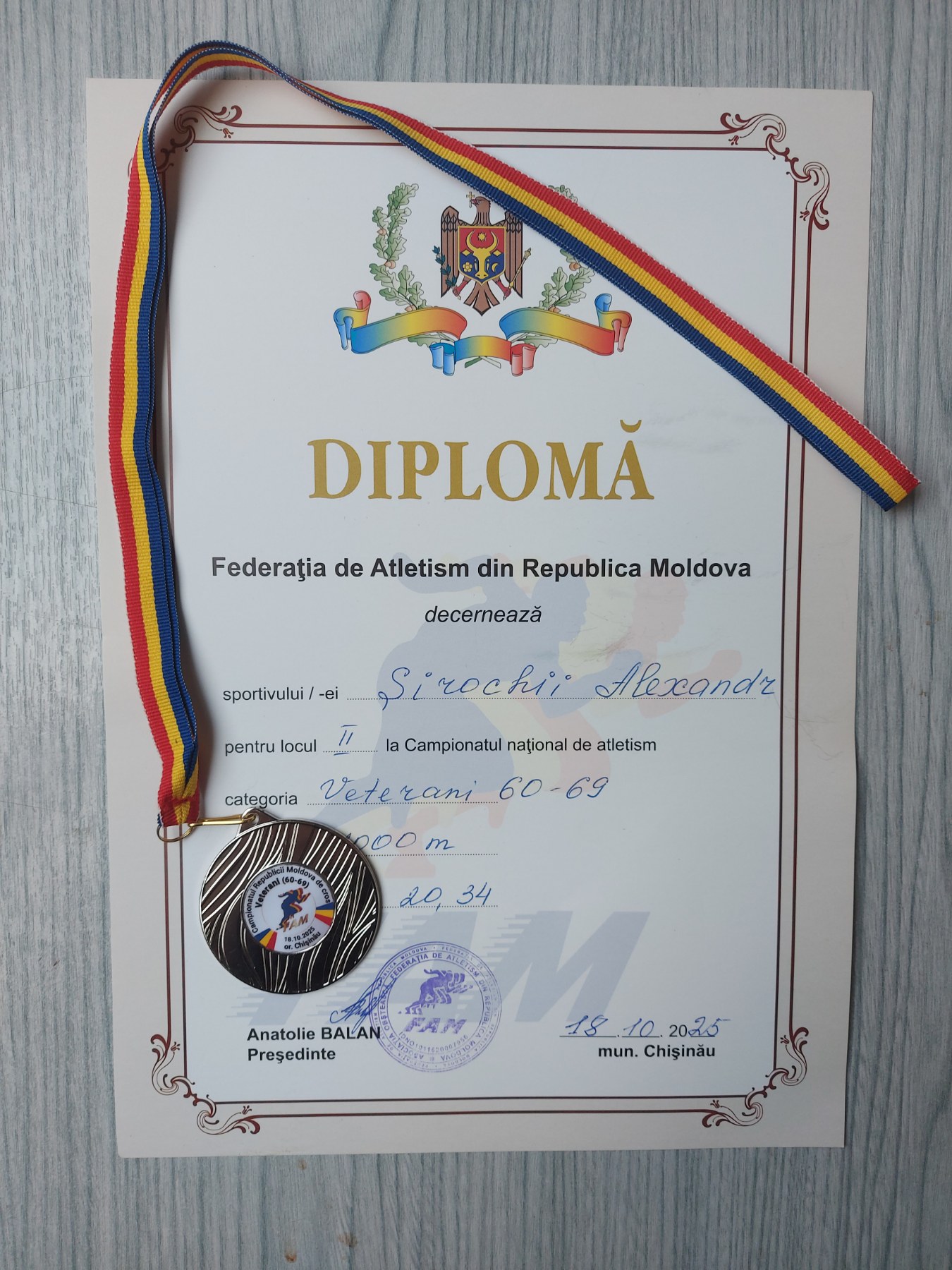 Profesorul Alexandr Sirochii, cadru didactic al IPLT cu Frecvență Redusă nr. 2 din Chișinău, a obținut locul II la Campionatul Republicii Moldova la cros pe teren accidentat, categoria 60–69 de ani. 🏃♂️🇲🇩